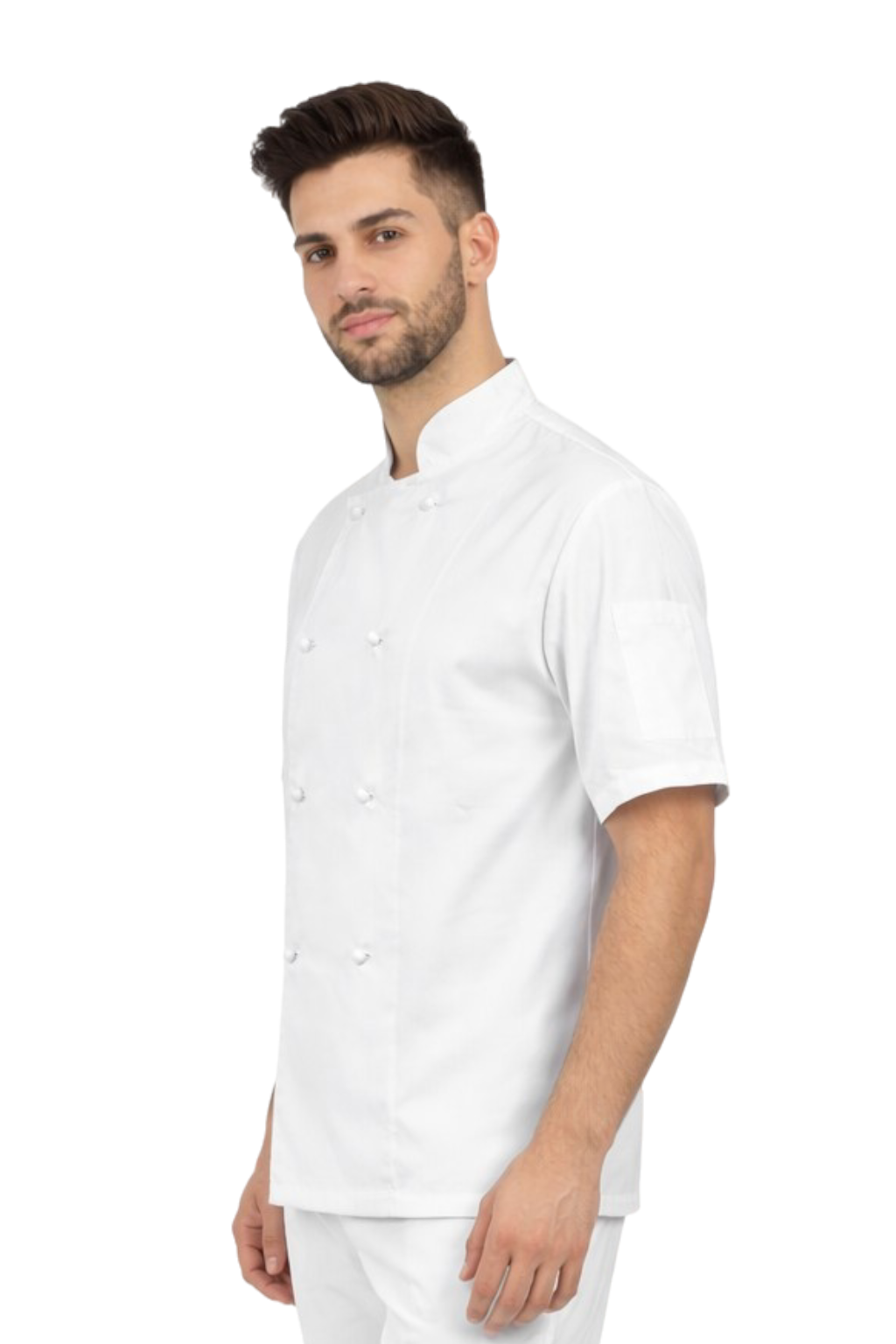 Bijela muška kuhinjska bluza s bijelim gumbima – gastronomski kut, kratki rukav