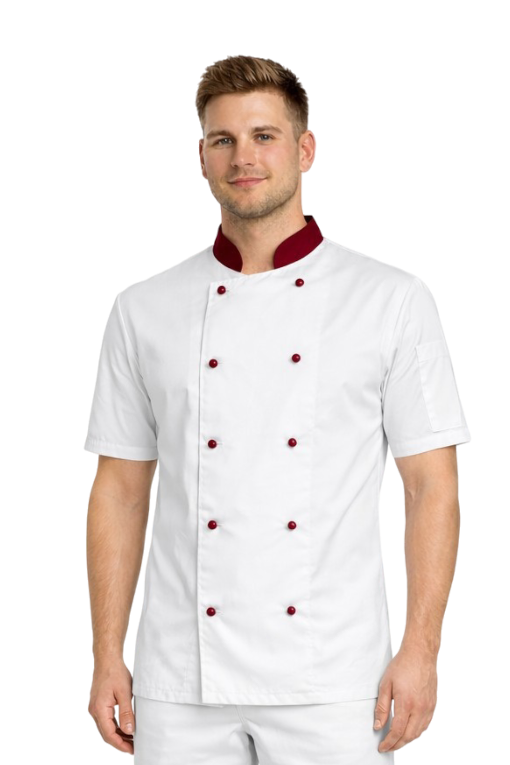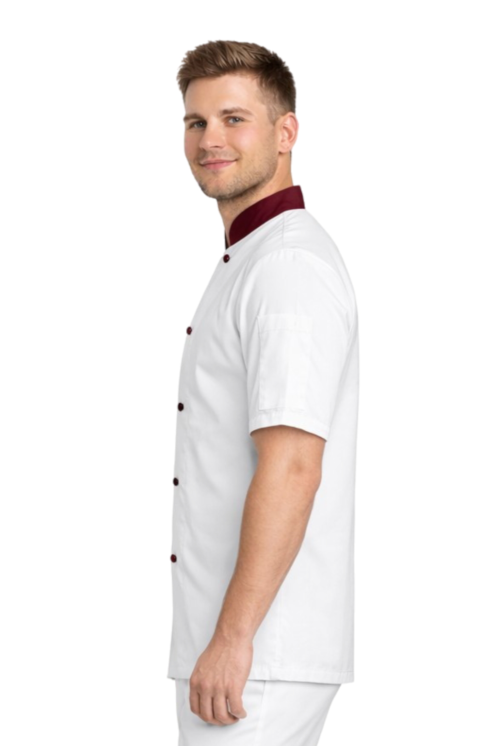 Bijela muška kuhinjska bluza s bordo ovratnikom, gumbima – gastronomski kut, kratki rukav