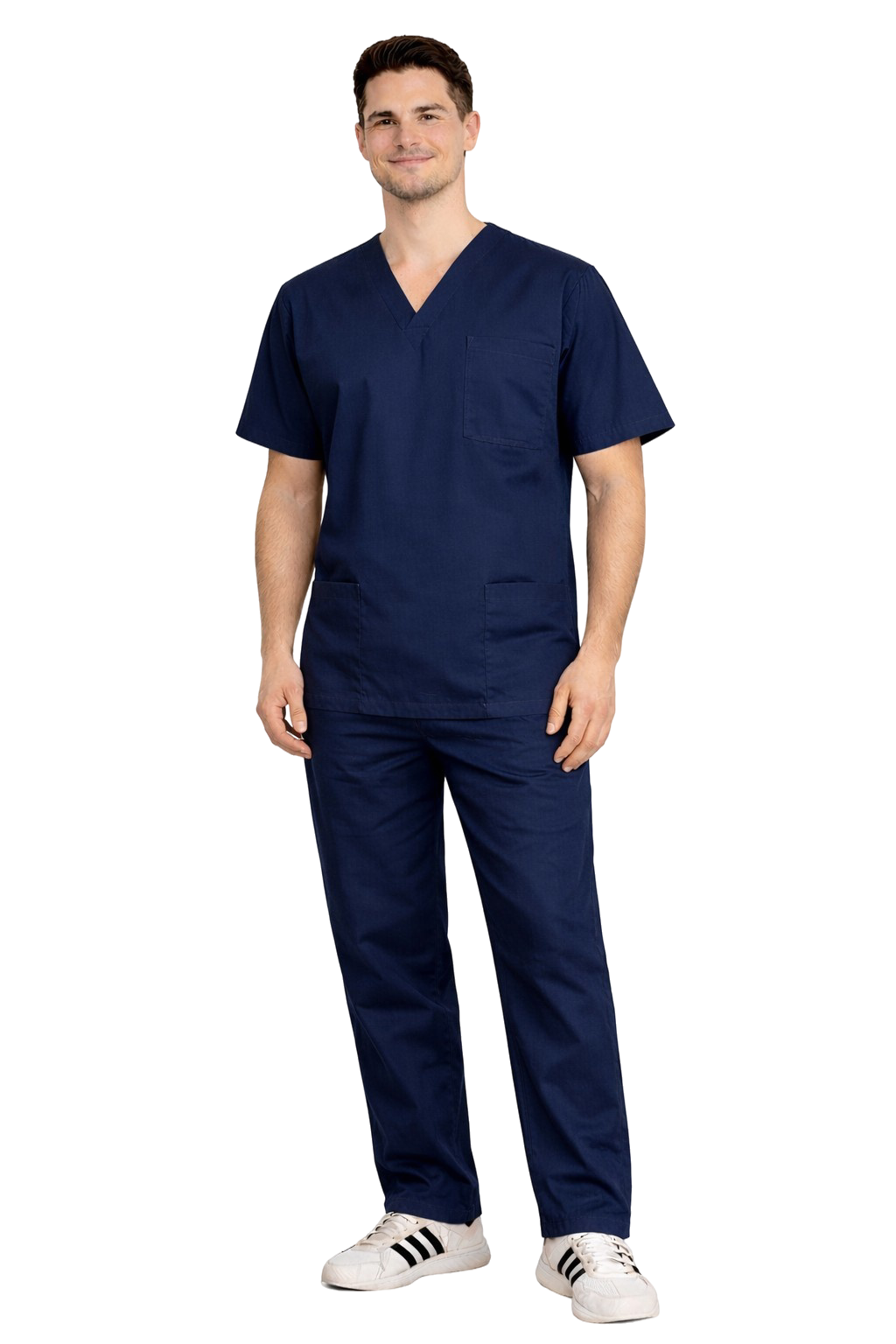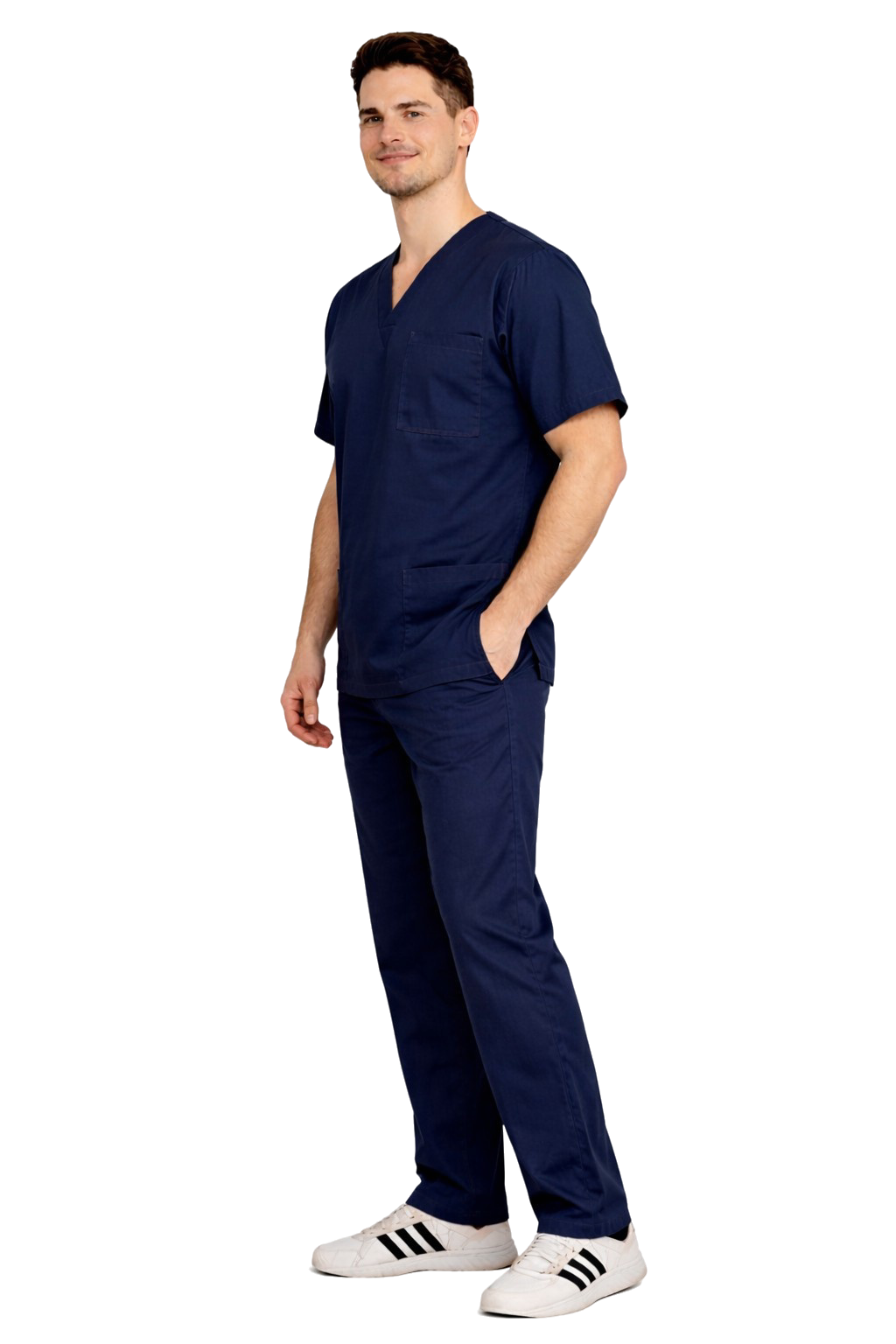 Komplet medicinske odjeće uniseks u tamno plavoj boji, izrađen 100% od visokokvalitetnog pamuka, profesionalna je odjeća namijenjena kirurzima, liječnicima, medicinskim sestrama, rehabilitatorima i medicinskom osoblju. Odlično će se snaći na bolničkim odjelima, u ordinacijama i na operacijskom bloku.