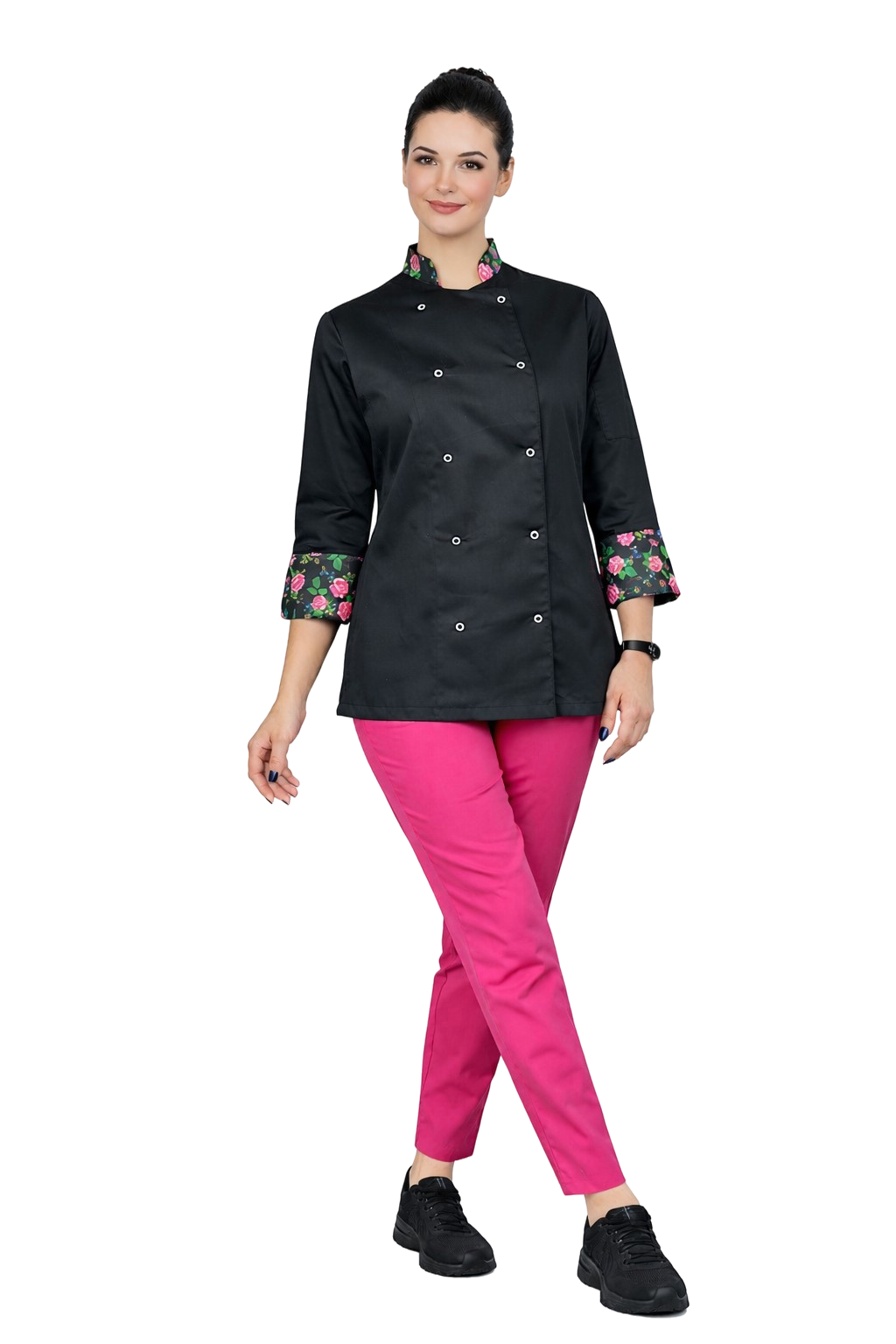 Ženski kuharski set sastoji se od prilagođene kuharske košulje s 3/4 rukavima i kuharskih hlača. Suvremena je to gastronomska uniforma dizajnirana sa ženama koje rade u profesionalnoj gastronomiji na umu. Set kombinira funkcionalnost, udobnost i estetiku, ispunjavajući visoke standarde koji vrijede u restoranskim kuhinjama.