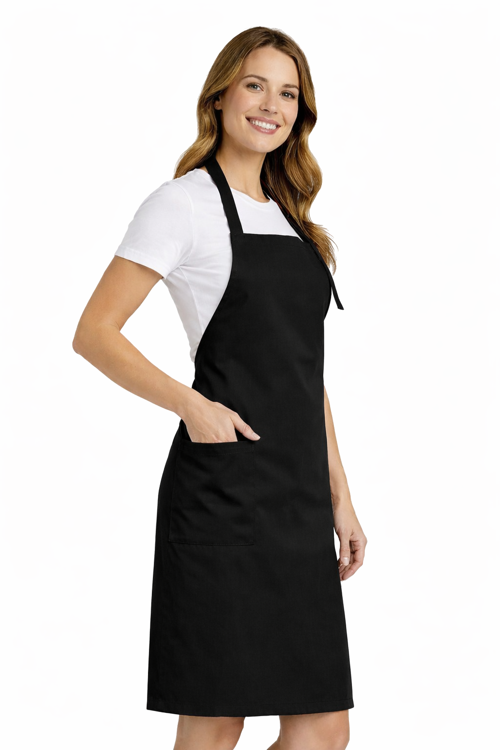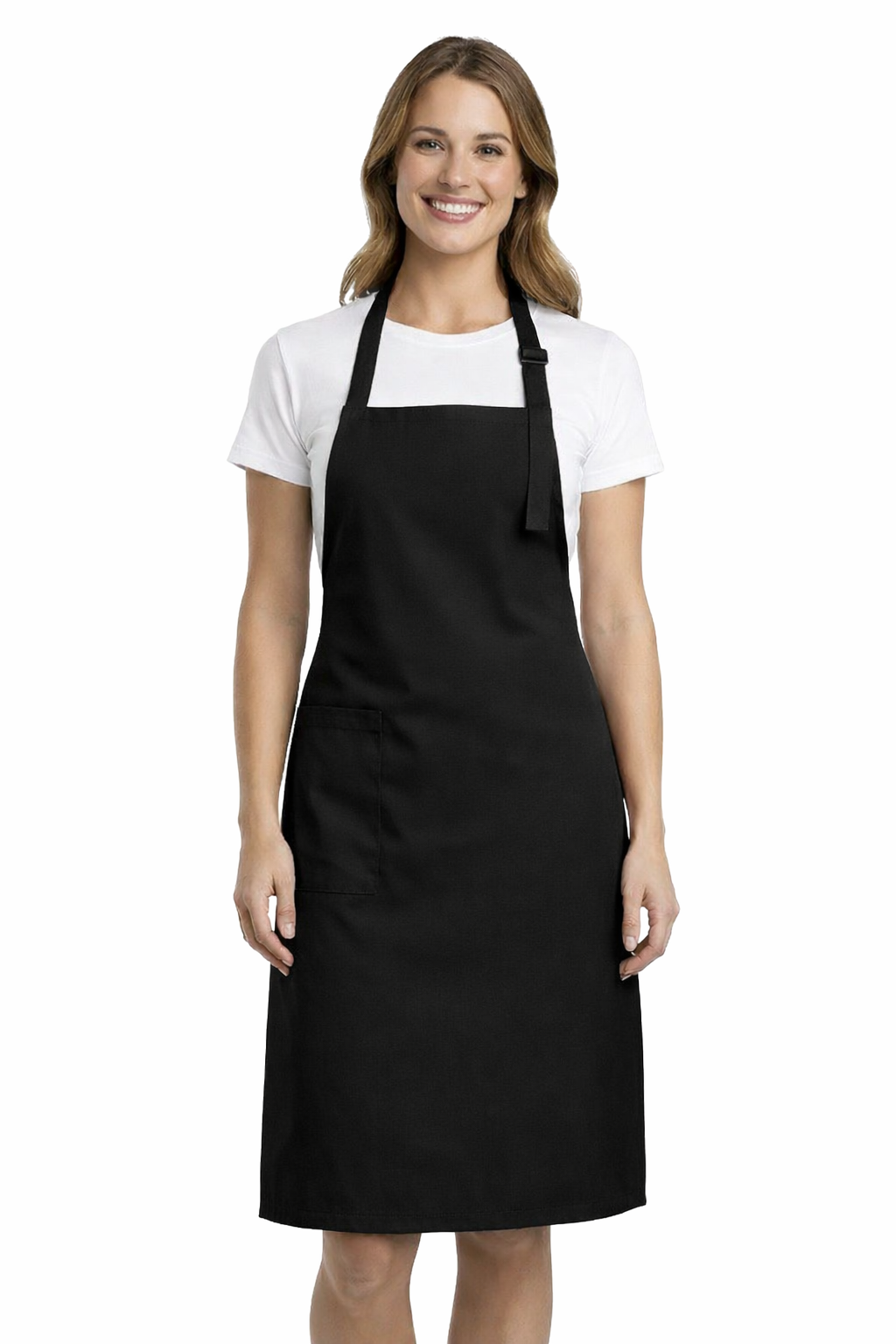 Pregača, osim zaštitne funkcije, također bi trebala izgledati profesionalno. Klasična crna boja naglašava eleganciju i univerzalni karakter gastronomske odjeće. Podesiva traka za vrat s plastičnom kopčom omogućuje savršeno prilagođavanje figuri.