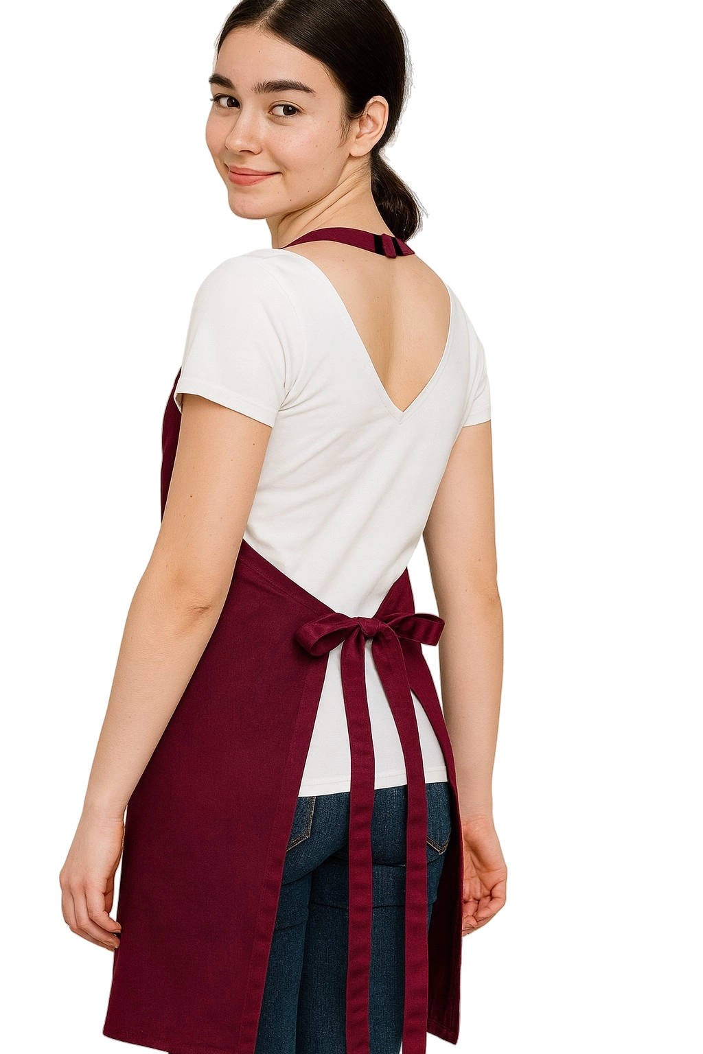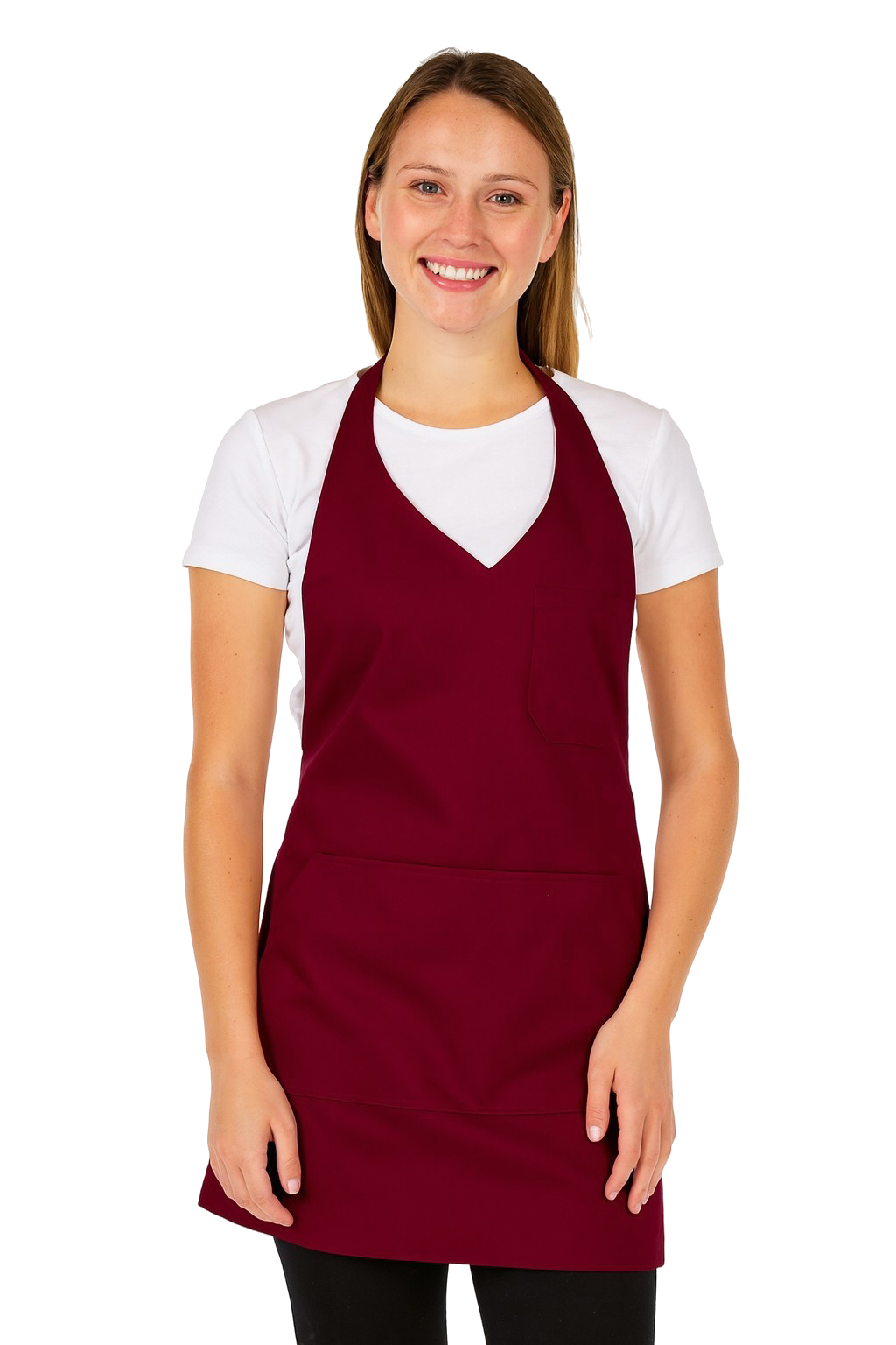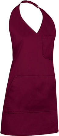 Pregača je napravljena od mješavine 65% poliestra i 35% pamuka, što jamči otpornost na oštećenja, često pranje i održavanje intenzivne bordo boje. Visoka gramaža od 210 g/m² čini materijal izdržljivim, ali i ugodnim za nošenje. Zahvaljujući podesivoj kopči na naramenicama i vezivanju na leđima, pregaču je lako prilagoditi svakoj figuri.