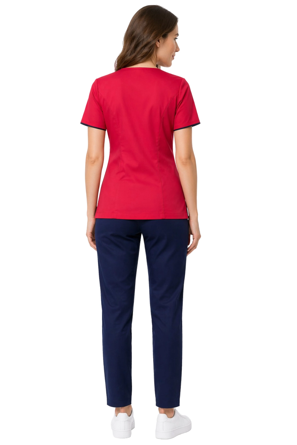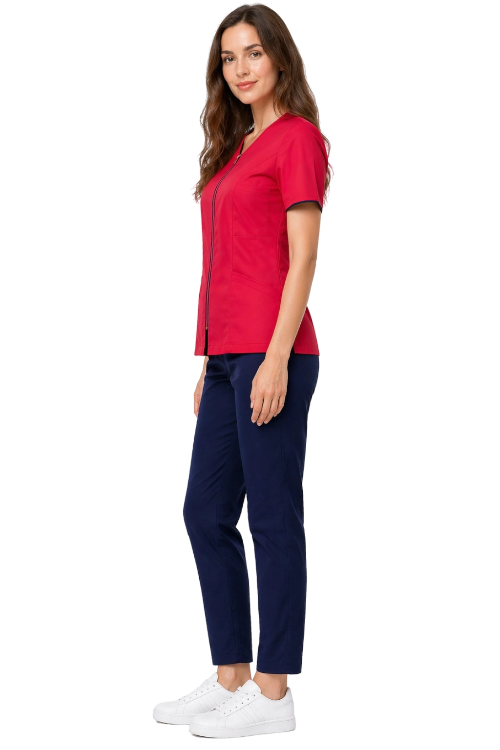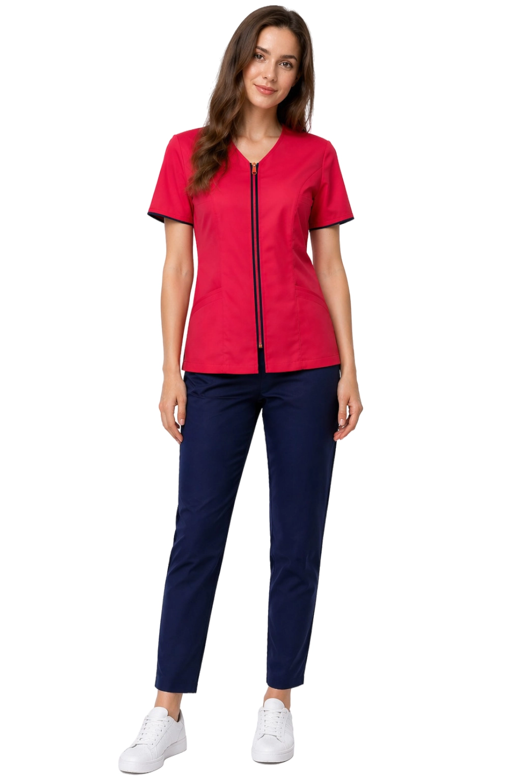 Medicinski set sastoji se od jakne na zatvarač i cigaret-hlača je moderan set medicinske odjeće osmišljen s obzirom na žene koje rade u medicinskoj, kozmetičkoj i uslužnoj industriji. Stilski amarant jakna u kombinaciji s elegantnim mornarsko plavim hlačama cigareta oblika stvara modnu i profesionalnu radnu odjeću koja osigurava udobnost tijekom cijelog radnog dana.