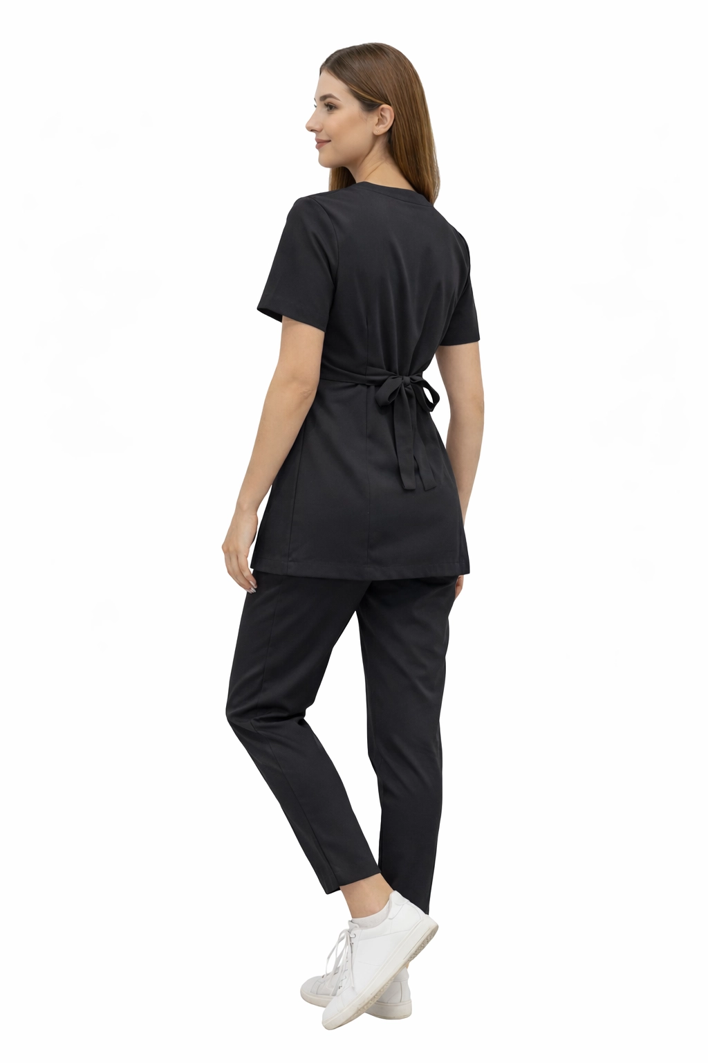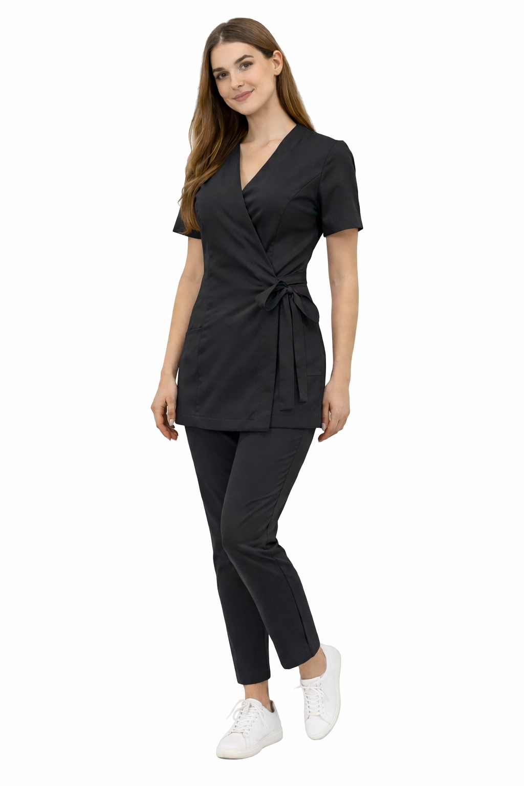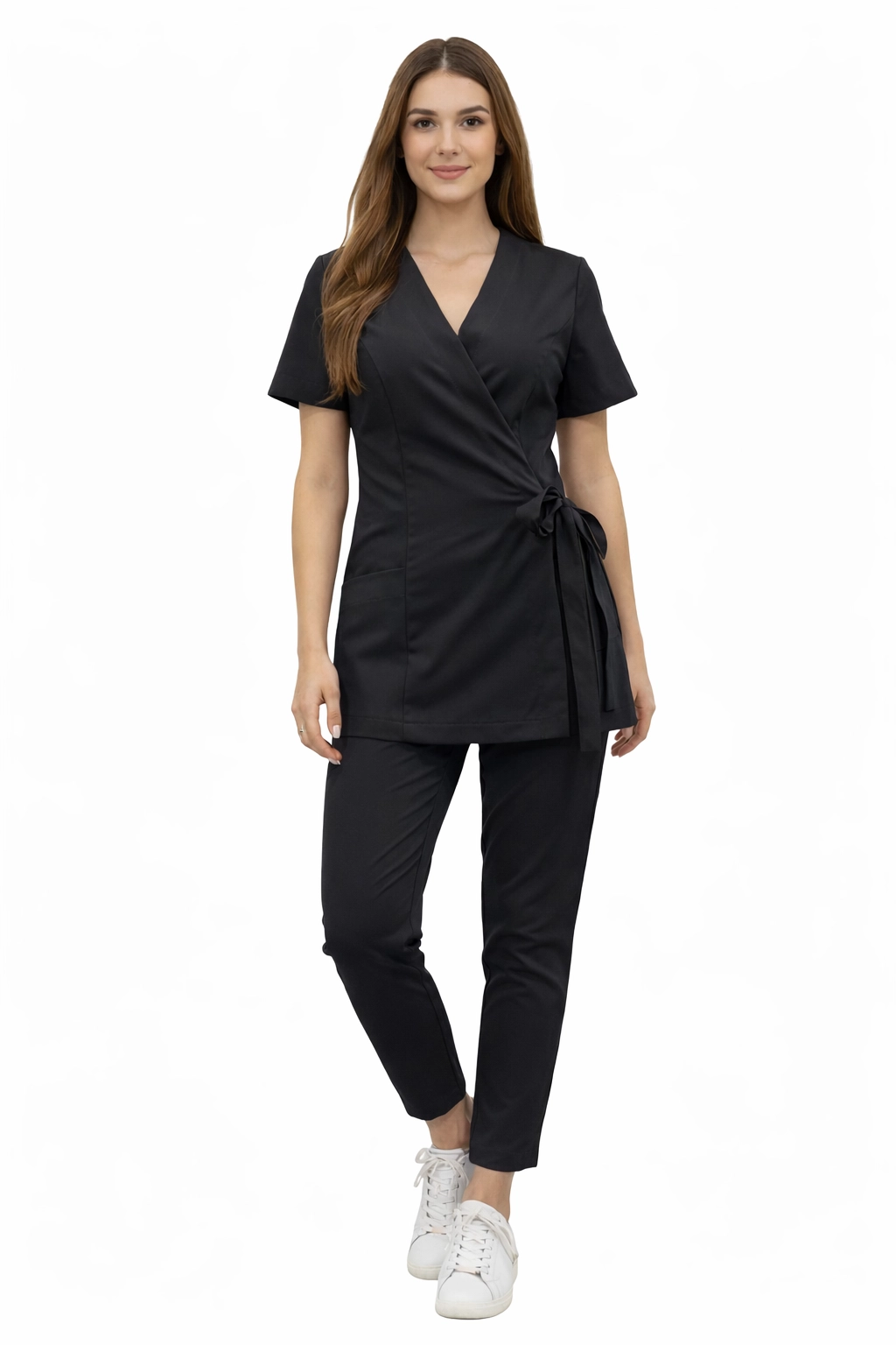 Set Basic Premium kombinacija je elegancije, funkcionalnosti i udobnosti - dizajniran s mišlju o ženama koje rade u medicinskom, kozmetičkom i wellness sektoru. Sastoji se od bluze s preklopom (tunike) i hlača Basic Premium, stvarajući koherentnu, stiliziranu medicinsku uniformu.