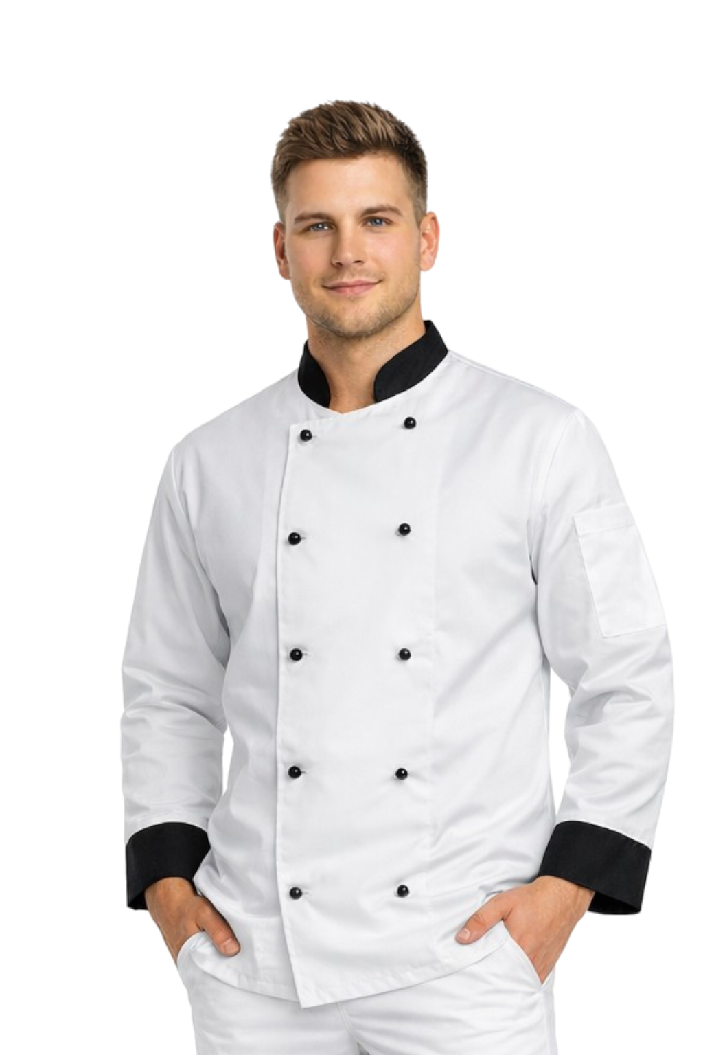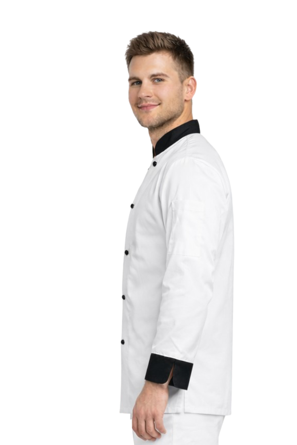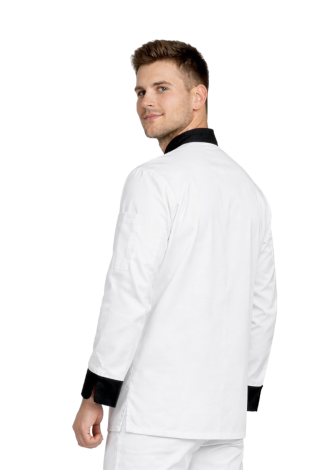 Muška bijela kuhinjska bluza s crnim manžetama, ovratnikom, gumbima – gastronomski kut, dugi rukav