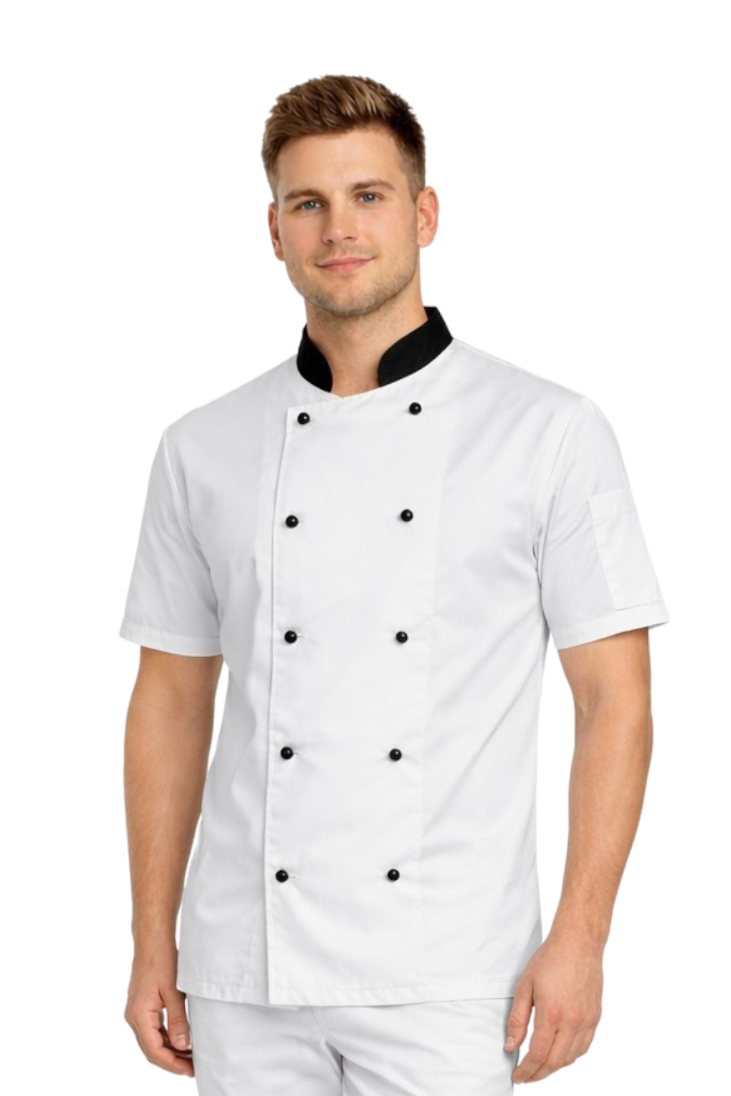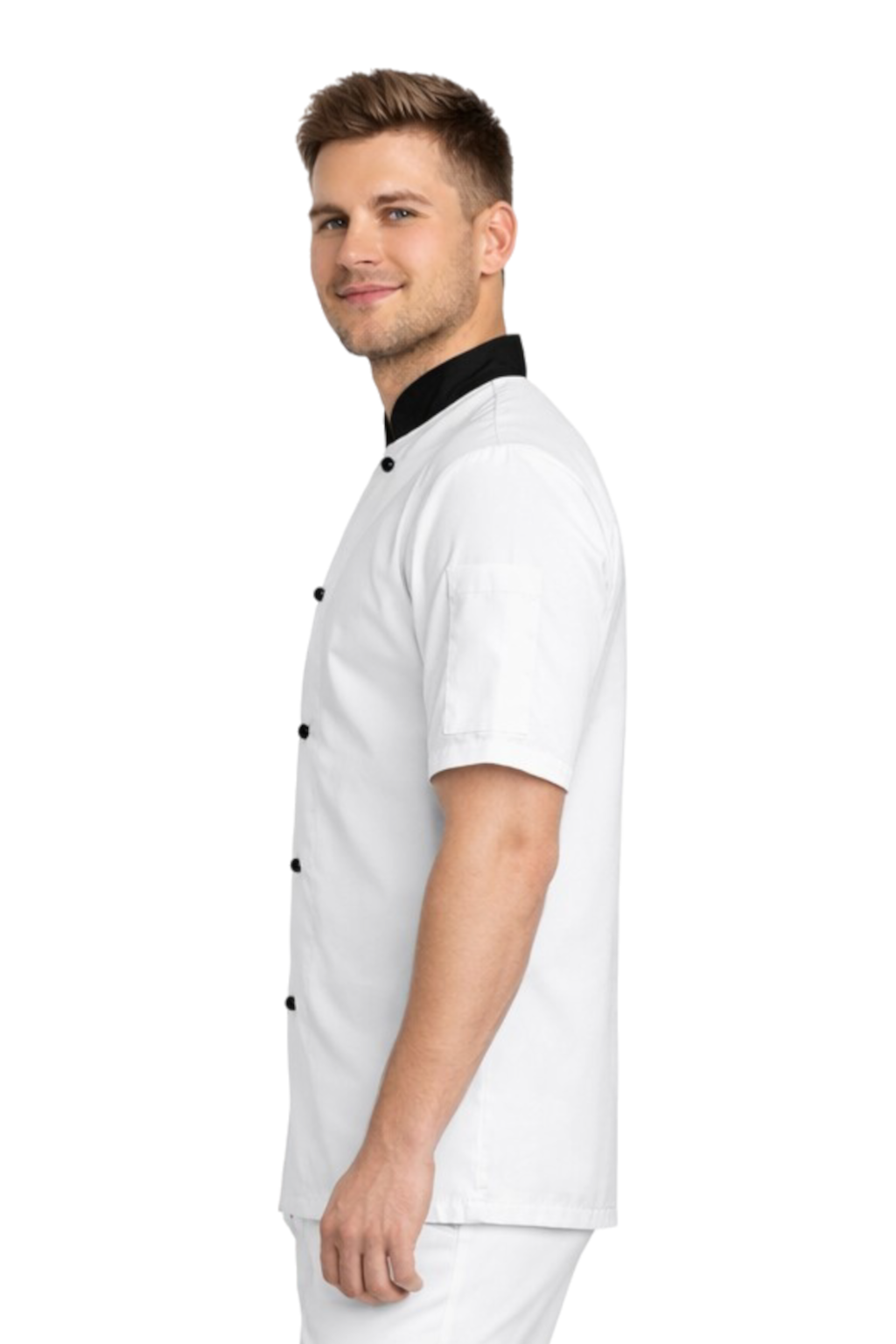 Muška bijela kuhinjska bluza s crnom ovratnikom, gumbima – gastronomski kut, kratki rukav