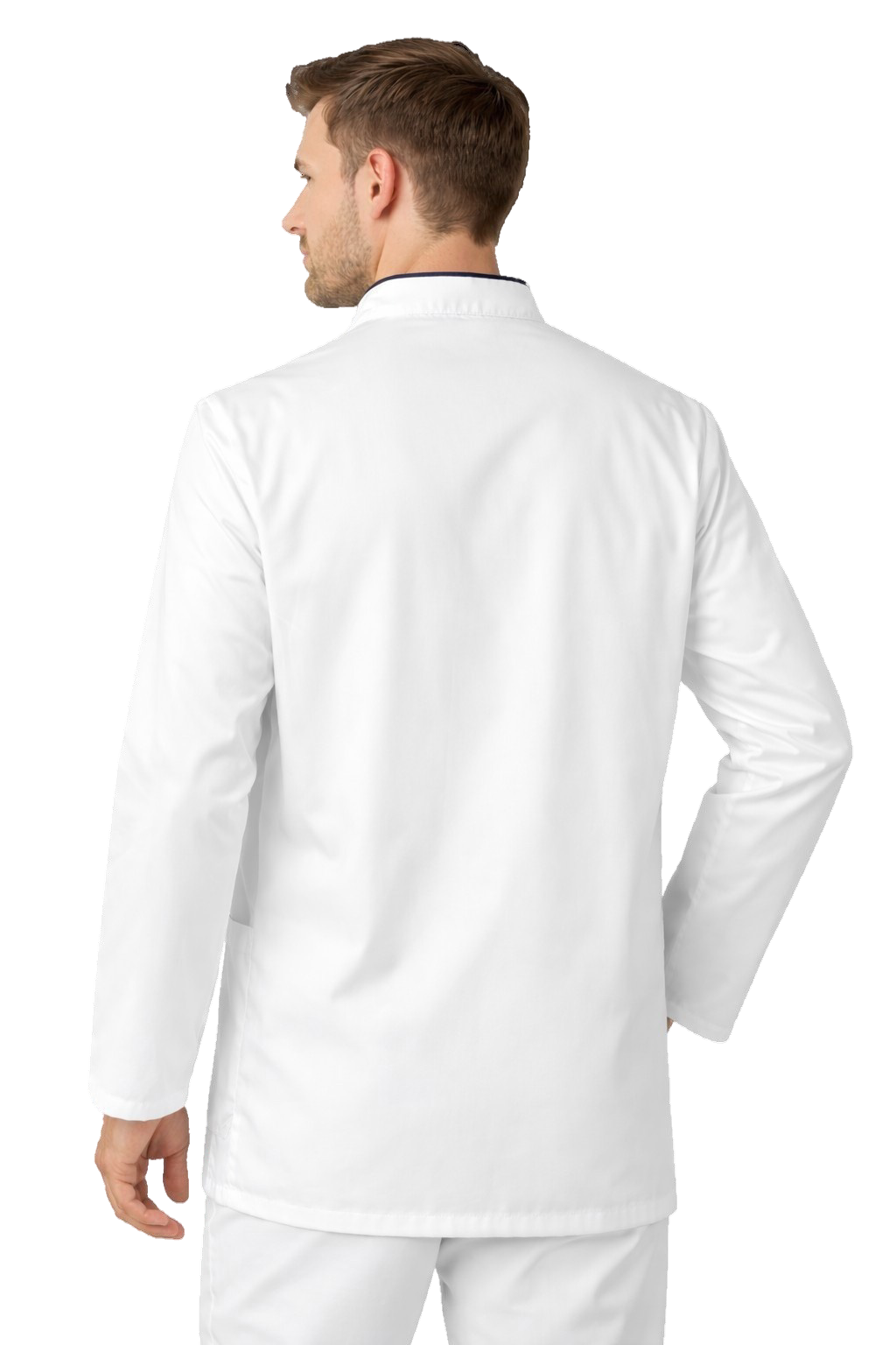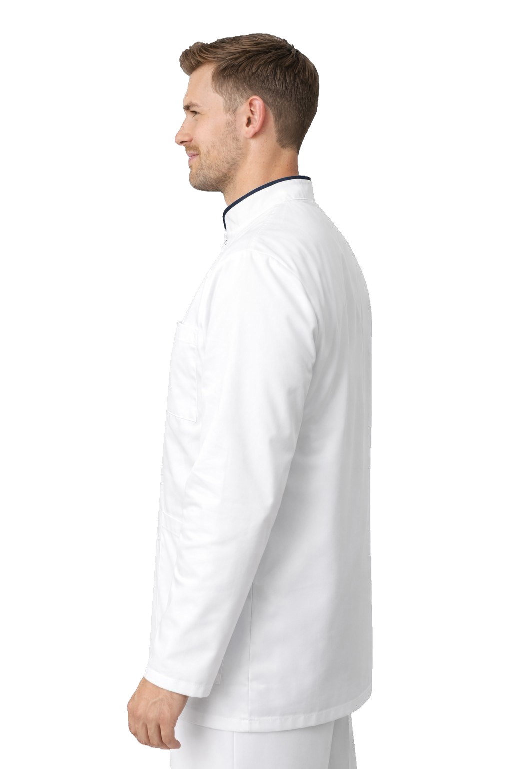 Muška bijela medicinska jakna s mornarsko plavim okovratnikom je elegantan i funkcionalan komad medicinske odjeće, dizajniran s mislima o liječnicima, stomatolozima, internistima, veterinarima, rehabilitatorima, kao i studentima medicinskih smjerova. Njen klasični kroj u kombinaciji s modernim završetcima pruža profesionalan izgled i udobnost nošenja tijekom cijelog radnog dana.