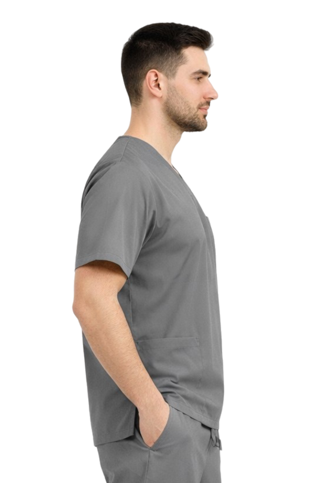 Otkrijte našu elegantnu, sivu medicinsku bluzu za muškarce, idealnu za liječnike, medicinske sestre, sanitarnike i stručnjake iz beauty industrije. Zbog svog jednostavnog kroja bez trokira i remena, bluza nudi udobnost i funkcionalnost, što je čini izvrsnim izborom za kirurge, medicinske sestre i instrumentarije. Izrađena od kvalitetne, jake tkanine, zadržava intenzitet boje i stabilnost veličine čak i nakon višekratnog pranja. Odaberite udobnost i profesionalan izgled u jednom proizvodu!