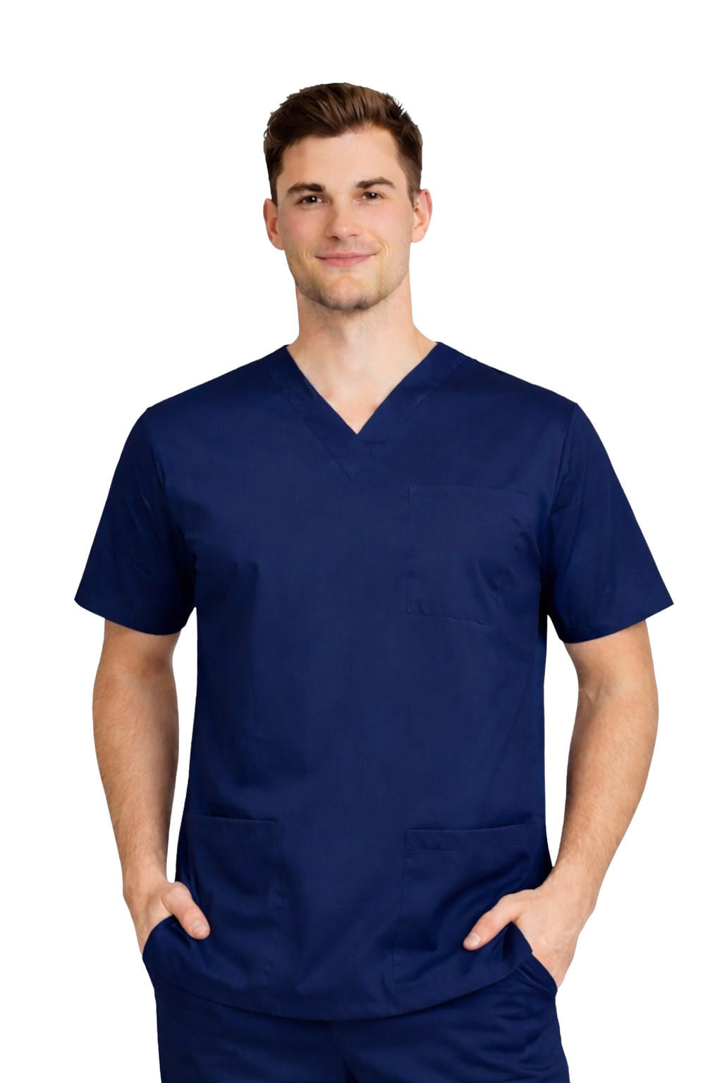 Tamno plava SLIM medicinska majica za muškarce je moderna i udobna medicinska odjeća dizajnirana za liječnike, medicinske sestre, stomatologe, fizioterapeute, veterinare i studente medicinskih smjerova. Zahvaljujući SLIM kroju, majica savršeno pristaje uz tijelo, a elastičan materijal s dodatkom elastana osigurava slobodu pokreta i udobnost tijekom rada.