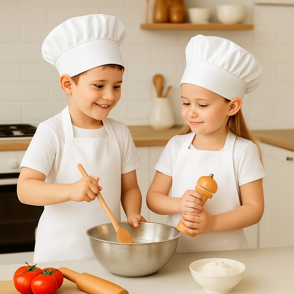 Pregač i kapa osmišljeni su s obzirom na najmlađe kuhare. Komplet se pokazuje korisnim kako kod kuće, tako i na kulinarskim radionicama, potičući razvoj strasti i mašte.