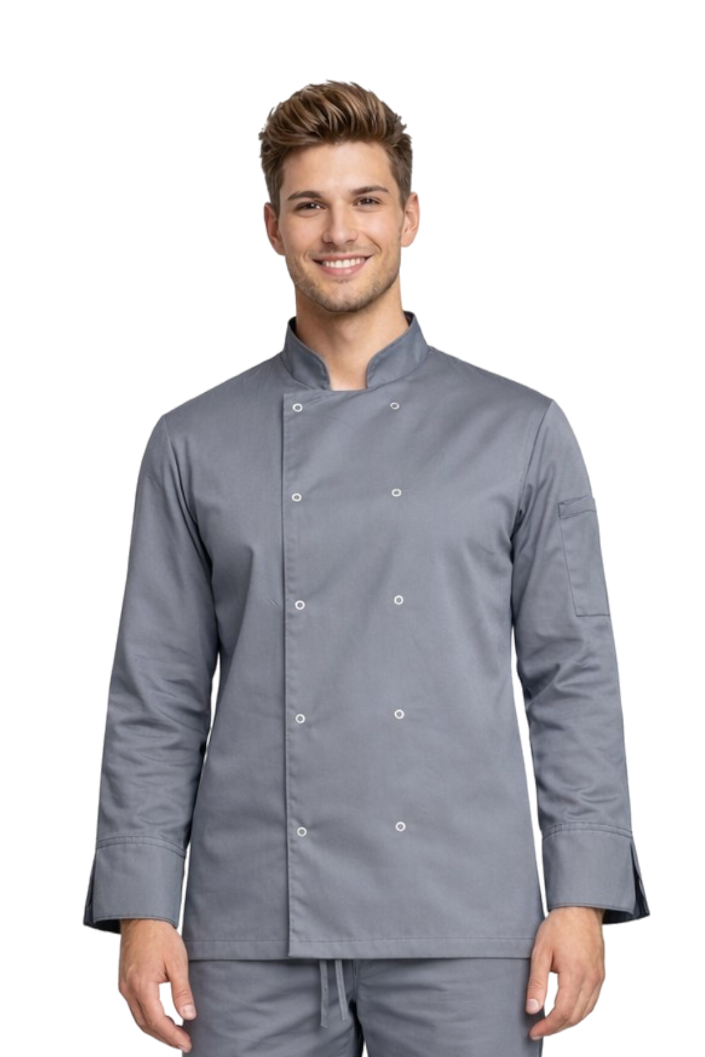 Siva kuharska bluza s kopčama je moderna gastronomska odjeća dizajnirana za profesionalce koji rade u dinamičnom kuhinjskom okruženju. Model kombinira funkcionalnost, visoki komfor nošenja i estetski, elegantan izgled, stoga će se odlično uklopiti u restoranima, hotelima, catering tvrtkama i slastičarskim radionicama.
