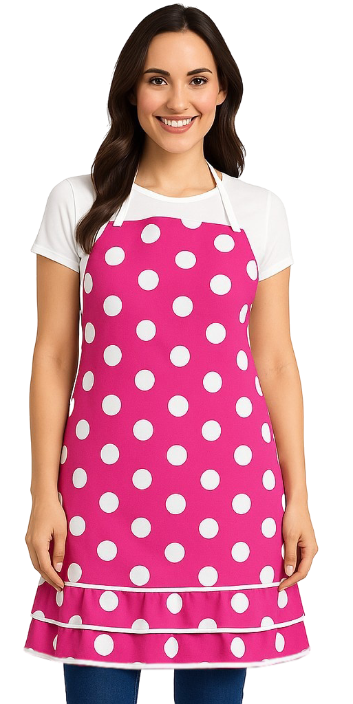 Stylizirani kuhinjski pregač za odrasle, ružičast s bijelim točkicama.