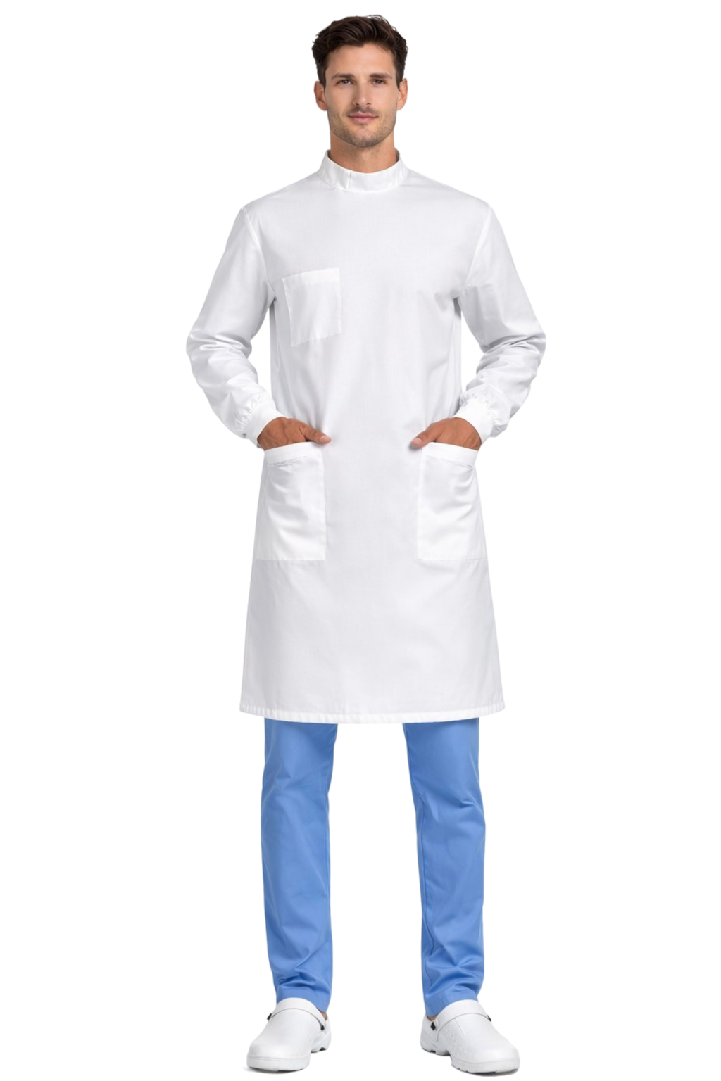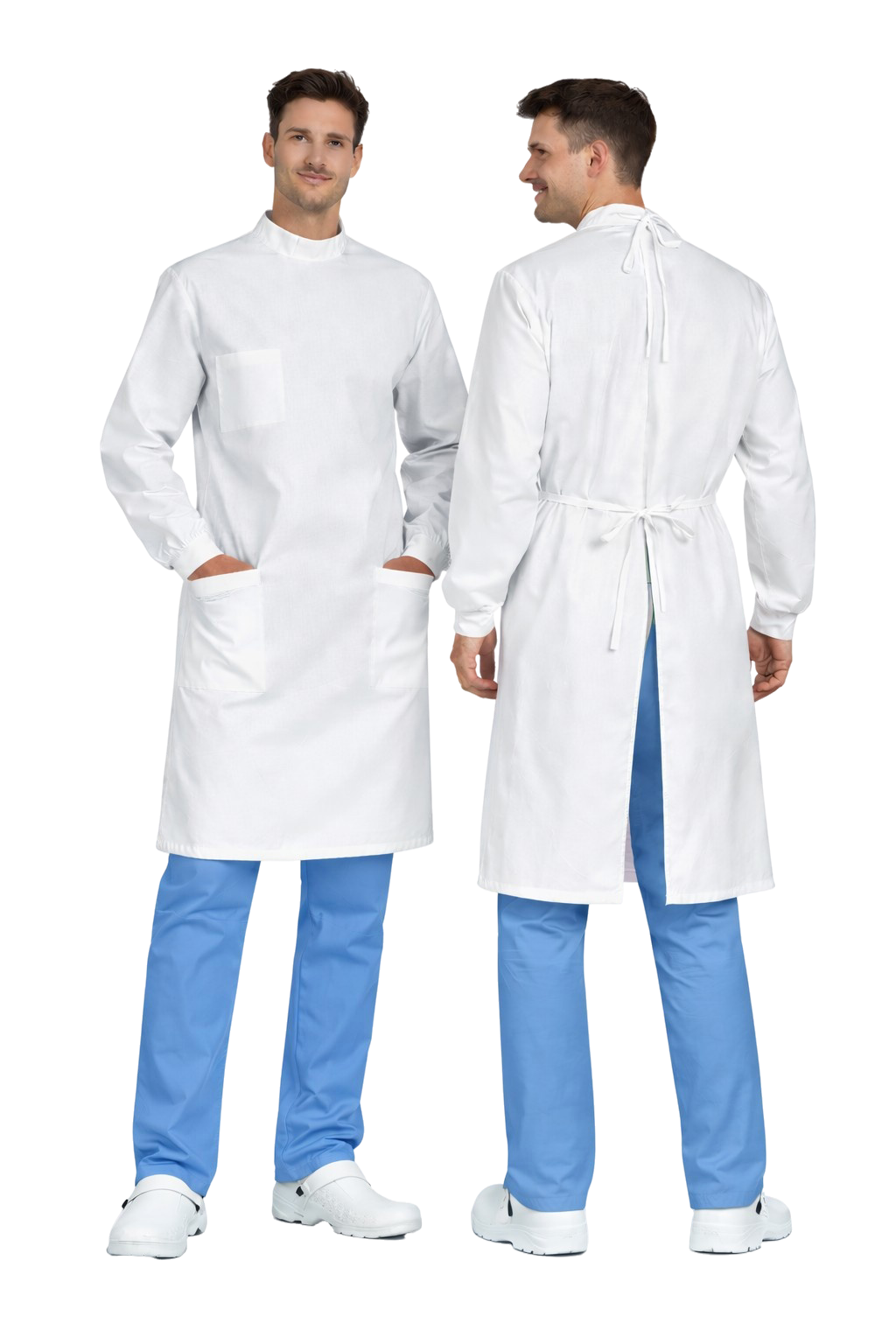 Pregača je izrađena od 100% pamuka, što osigurava prozračnost, udobnost i sigurnost čak i pri dugotrajnoj uporabi. Dugi rukavi s manžetama pružaju dodatnu zaštitu, sprečavajući prodiranje neželjenih tvari. Okrugli ovratnik i vezivanje sponama s leđa omogućuju bolje prilagođavanje pregače figuri.