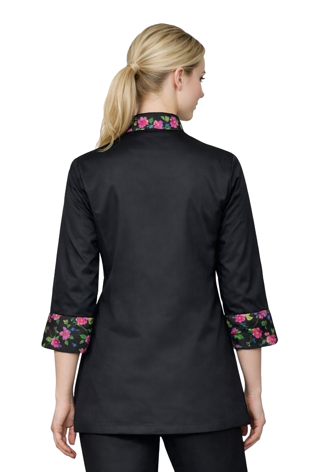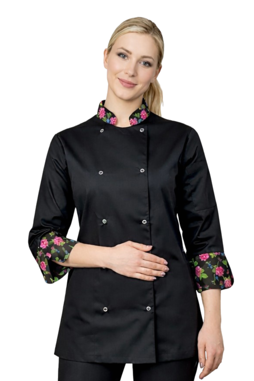 Kuharske bluze su bitan dio šefova odijela. Naš najnoviji dizajn je kuharska bluza s 3 rukava. Izrađena je od izuzetno izdržljive i robustne tkanine 65% poliester, 35% pamuk. Bluza se ističe cvjetnim umetcima na ovratniku i manšetama, izrađenima 100% od pamuka. Bluza ima praktično zatvaranje na patentni zatvarač. Na rukavu je praktični džep. Bluza je izrađena u figuralnom kroju, stoga je namijenjena ženama koje rade u restoranima, hotelima, pubovima, kafićima i obrazovnim ustanovama.