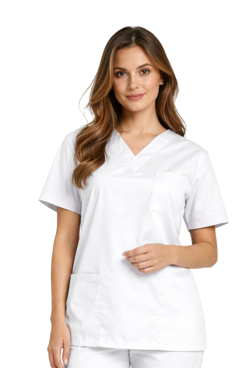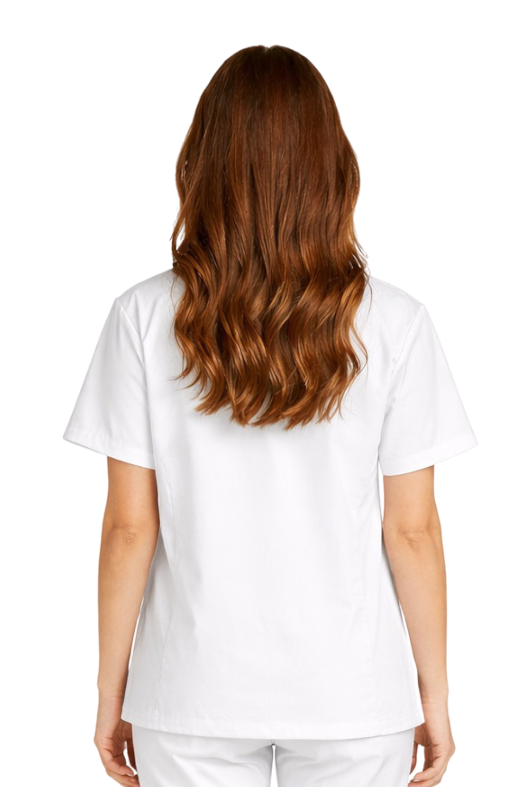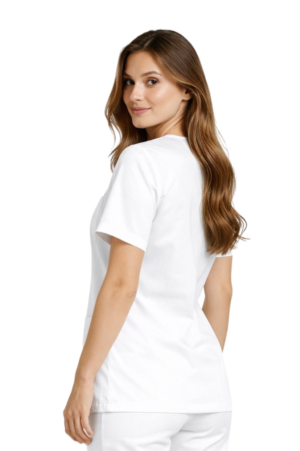 Bijela medicinska bluza za žene je idealan izbor za liječnice, medicinske sestre, fizioterapeutkinje i žene koje rade u beauty industriji – u spa centrima, wellness salonima i klinikama za estetsku medicinu. Posebno dizajnirana za kirurge i sestre instrumentarke, osigurava maksimalnu udobnost i sigurnost – bez suvišnih naramenica ili traka koje bi mogle smetati tijekom rada.