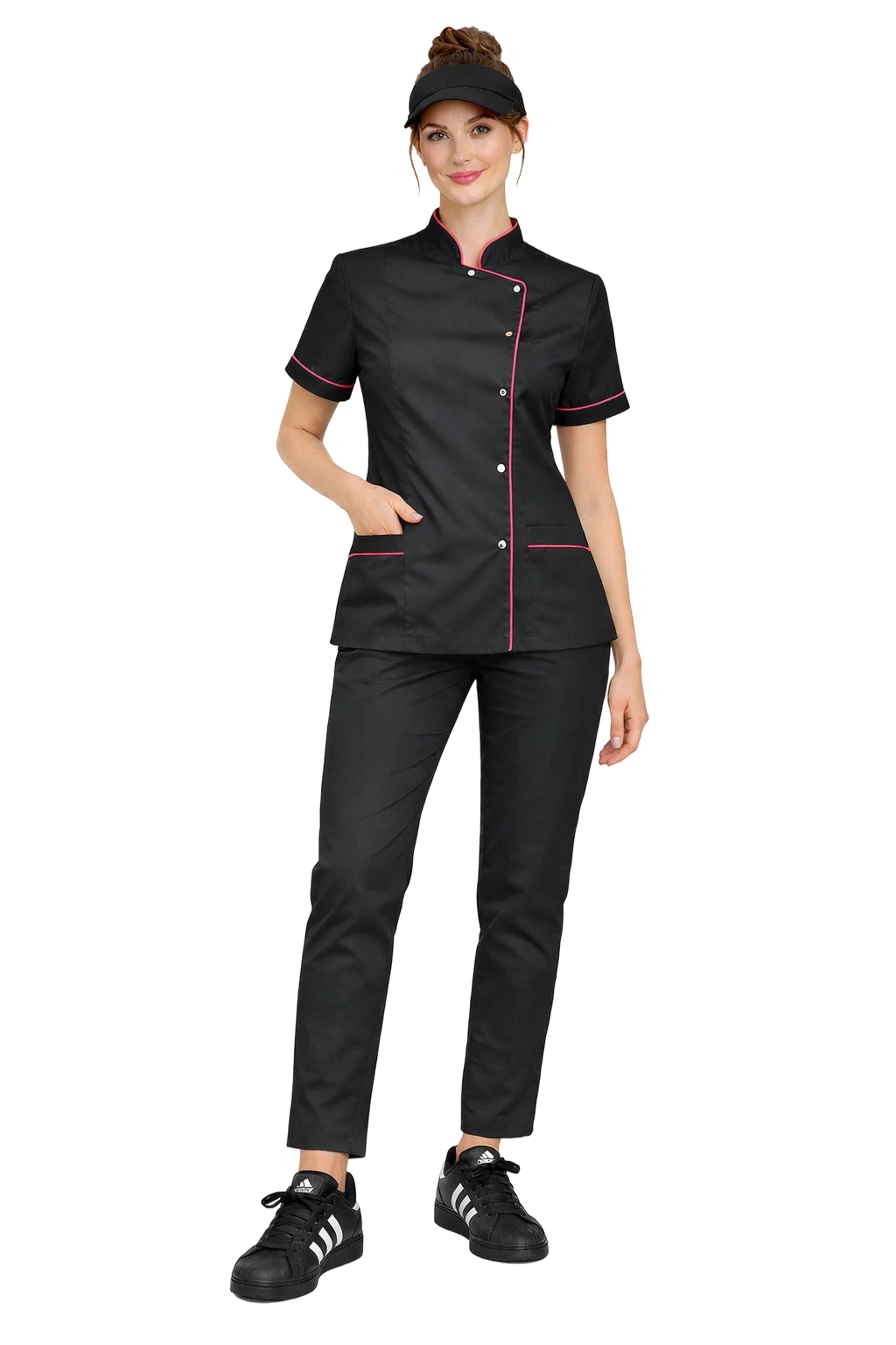 Jedinstven spoj klasične crne boje s ljubičastim obrubom haljini i hlačama daje cjelokupni elegantan i istaknuti izgled. Modeliran kroj kuharske haljine prelijepo naglašava siluetu, a cigaret hlače savršeno dopunjuju cijelokupni moderni i uredni kroj. To je set koji gradi profesionalni imidž i dodaje samopouzdanje na poslu.