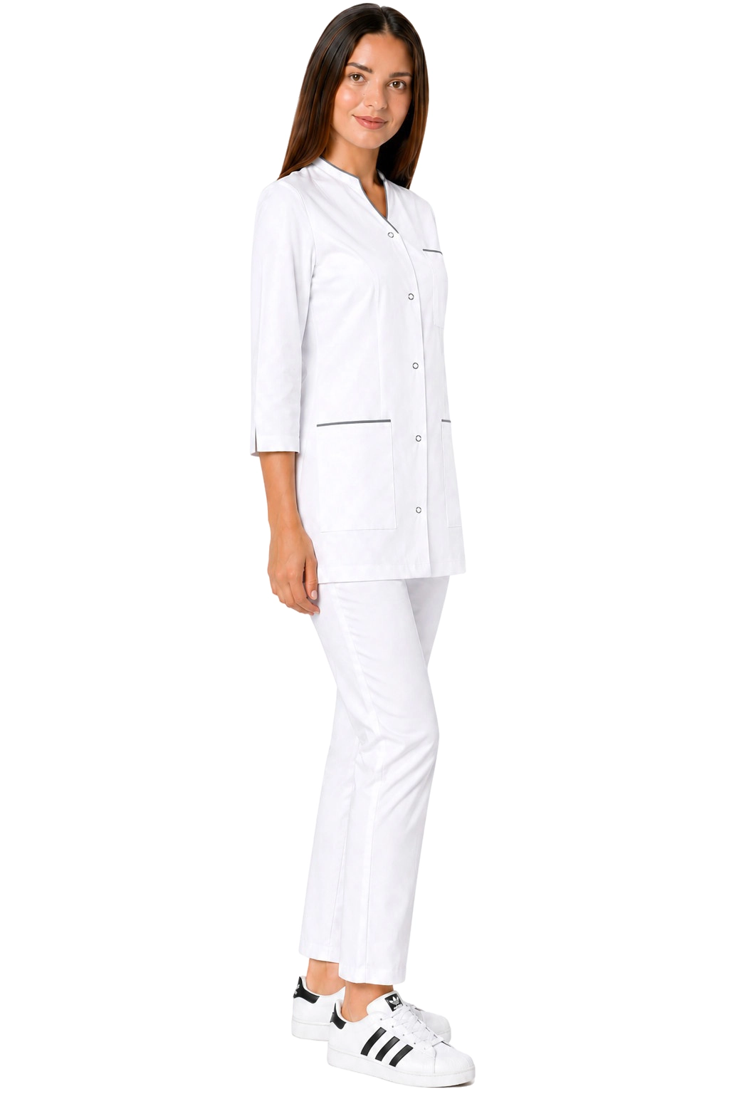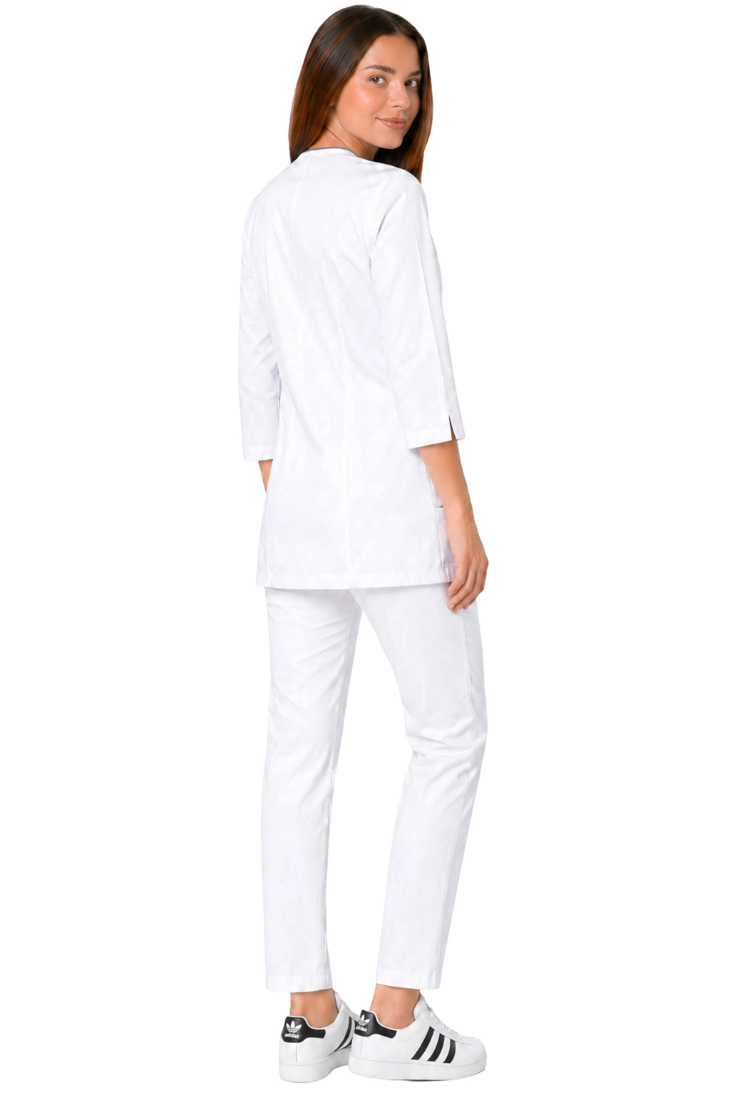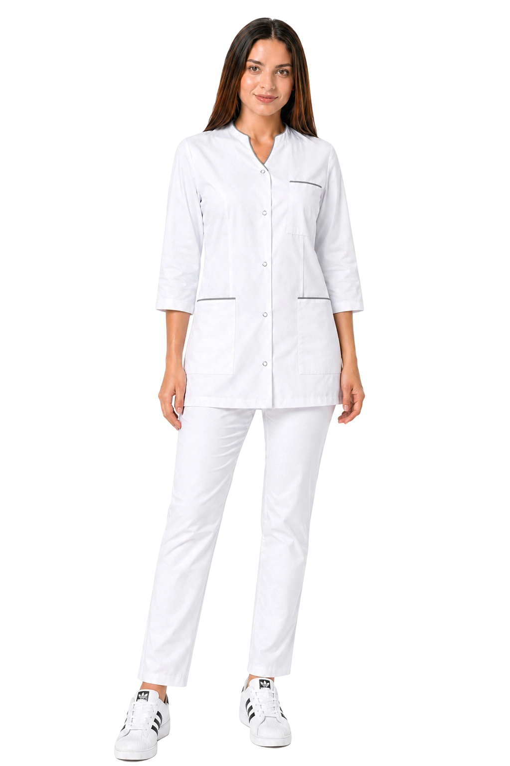 Komplet medicinske ženske odjeće bijele boje - 3/4 sakoi s sivim obrubom i bijele hlače PHARMACY COMFORT su odličan izbor za profesionalce u medicini i kozmetici. Naš jedinstveni set kombinira eleganciju s funkcionalnošću, pružajući udobnost tijekom svakodnevnog rada. Jakna se kopča s prednje strane, s estetskim obrubom, savršeno se slaže s udobnim cigaret hlačama, koje naglašavaju figuru. Stvoren s mislju na ljekarne, ljekarnike, optičare i administrativne radnike, naša uniforma također će se pokazati korisnom za medicinske sestre, kozmetičarke i frizere. Izaberite udobnu i stilsku odjeću koja će vam olakšati svakodnevne izazove!