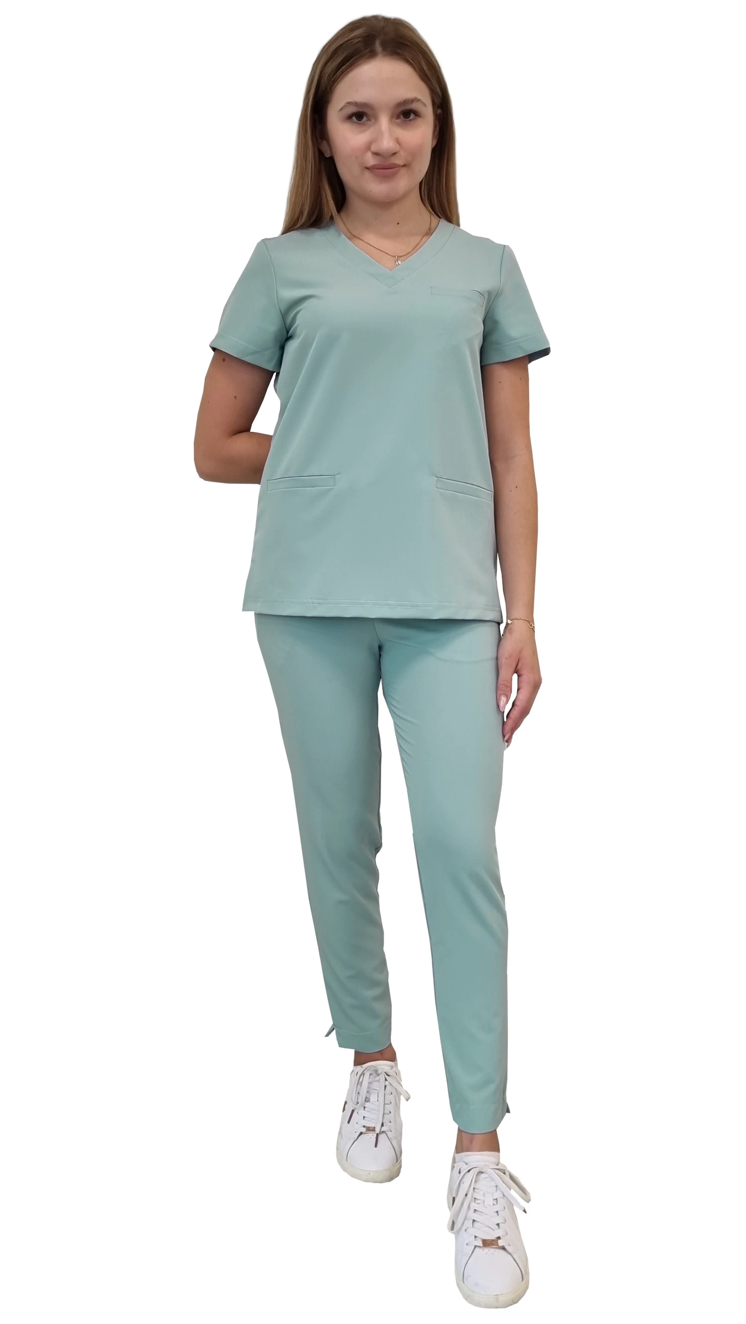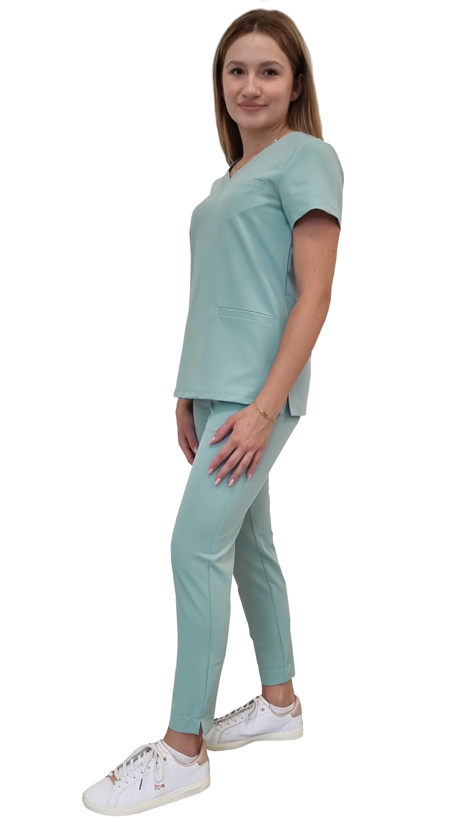 BASIC PREMIUM ženska medicinska uniforma u boji mente je profesionalni set koji kombinira moderan stil, udobnost i visoku kvalitetu tkanine. Set uključuje BASIC PREMIUM medicinsku bluzu i BASIC PREMIUM medicinske hlače, koje zajedno čine pouzdane scrubs za rad u medicinskoj i beauty industriji.