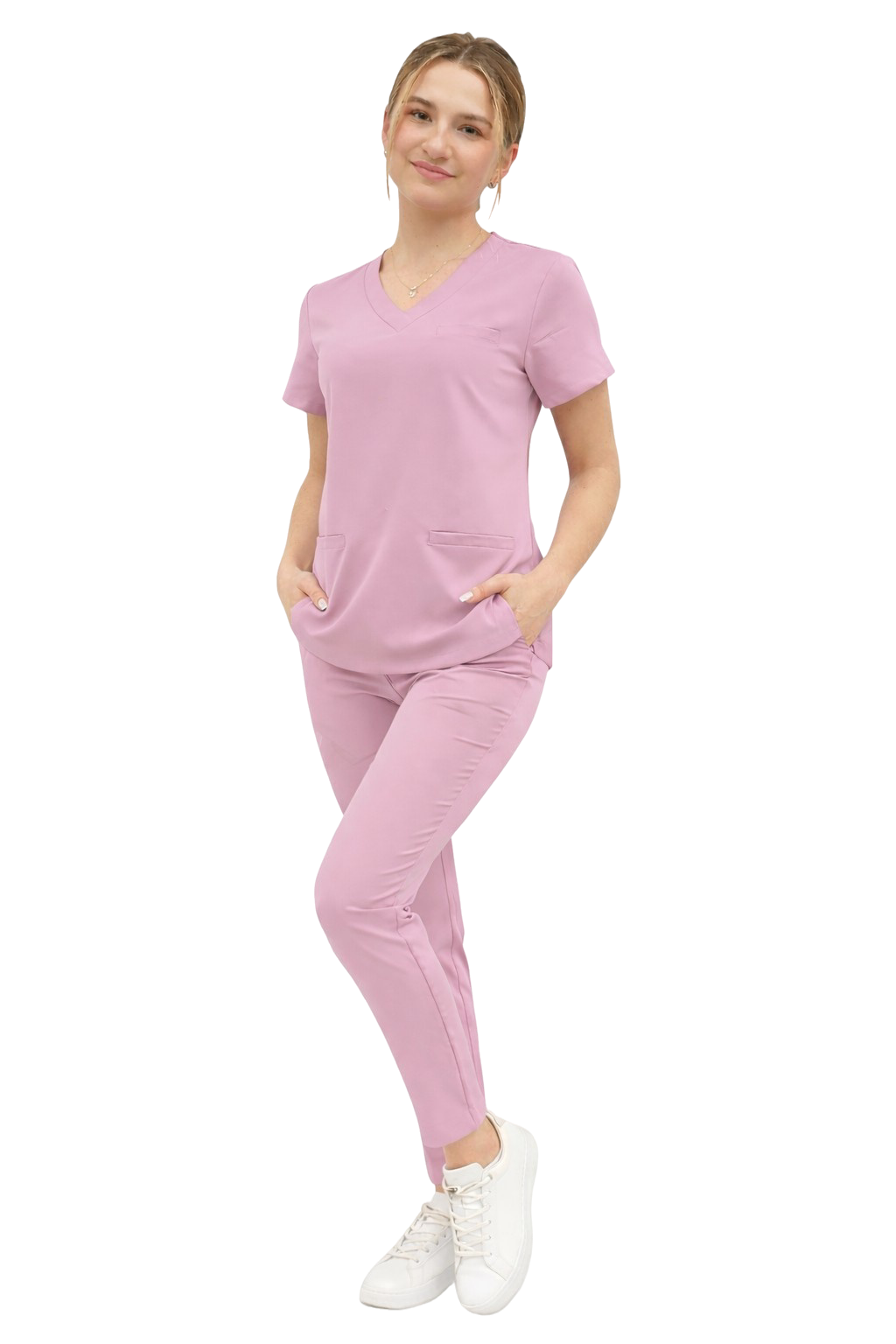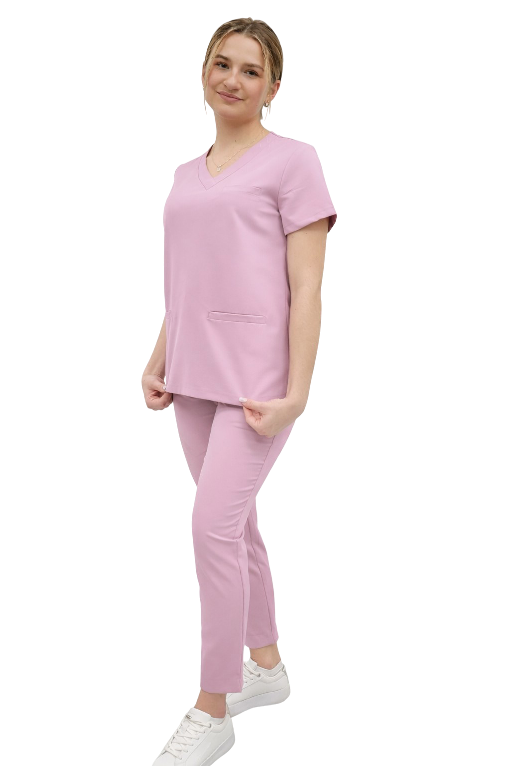 Medicinski uniform za žene BASIC PREMIUM u boji puder roza je profesionalni set koji spaja moderan stil, udobnost i visoku kvalitetu tkanine. U setu se nalazi medicinska bluza BASIC PREMIUM i medicinske hlače BASIC PREMIUM, koje zajedno čine pouzdane scrubs za rad u medicinskoj i beauty industriji.