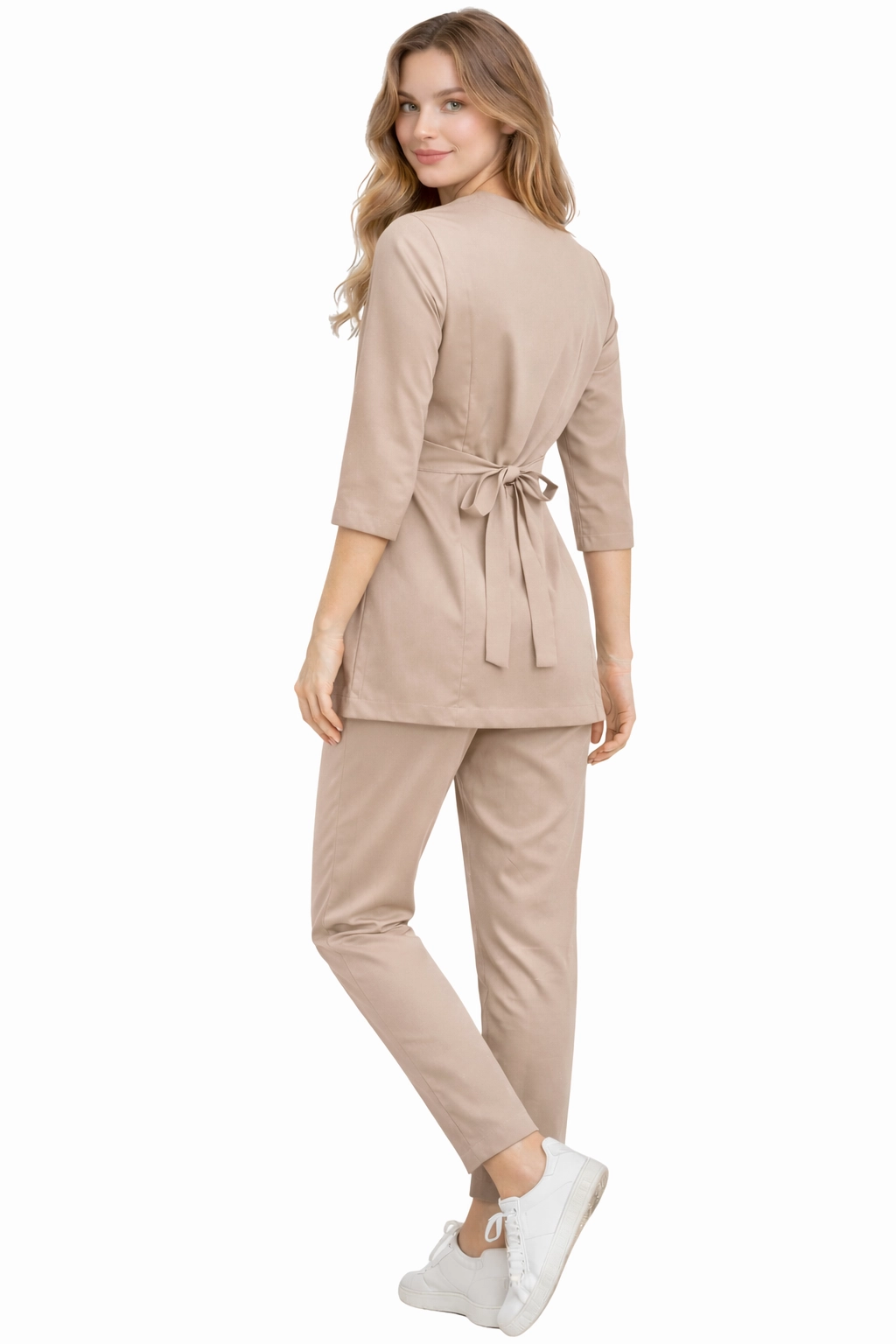 Ženski medicinski komplet BASIC PREMIUM u bež boji je harmonična kombinacija elegancije, udobnosti i funkcionalnosti. Set je dizajniran za žene koje rade u medicinskoj, kozmetičkoj i beauty industriji koje žele izgledati profesionalno, a istovremeno se osjećati opušteno tijekom cijelog radnog dana.